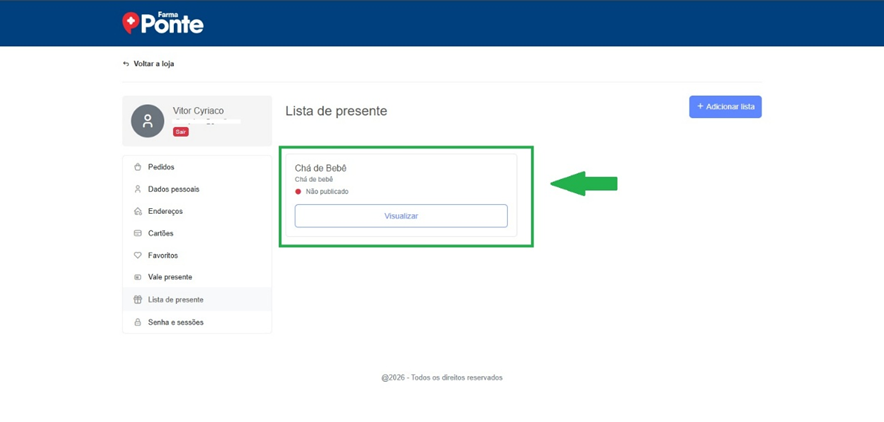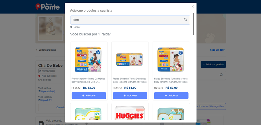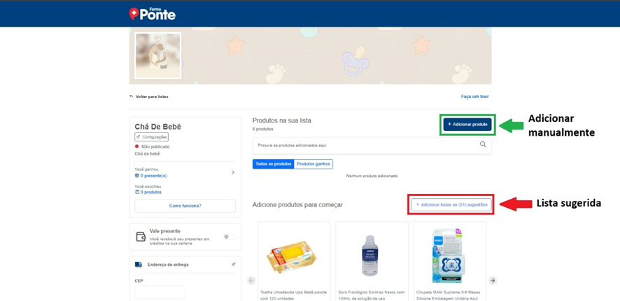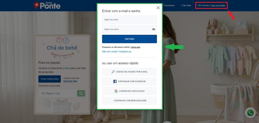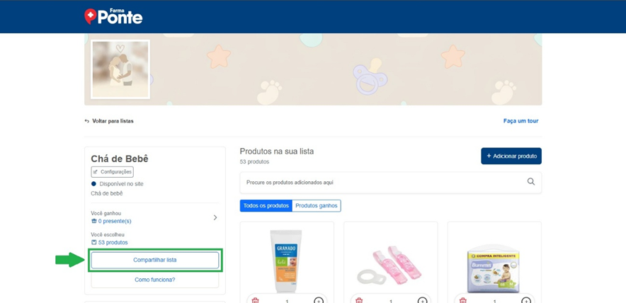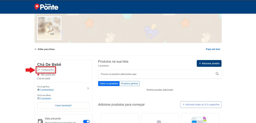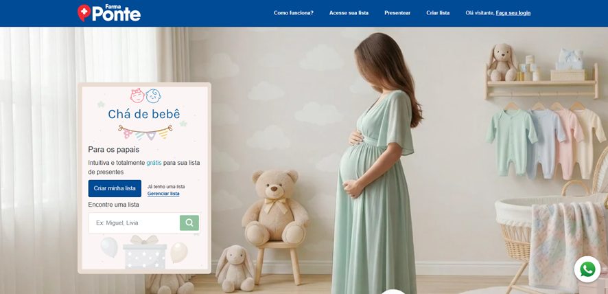 Acesse a página principal pelo link: https://www.farmaponte.com.br/lista-de-presente/cha-de-bebe/