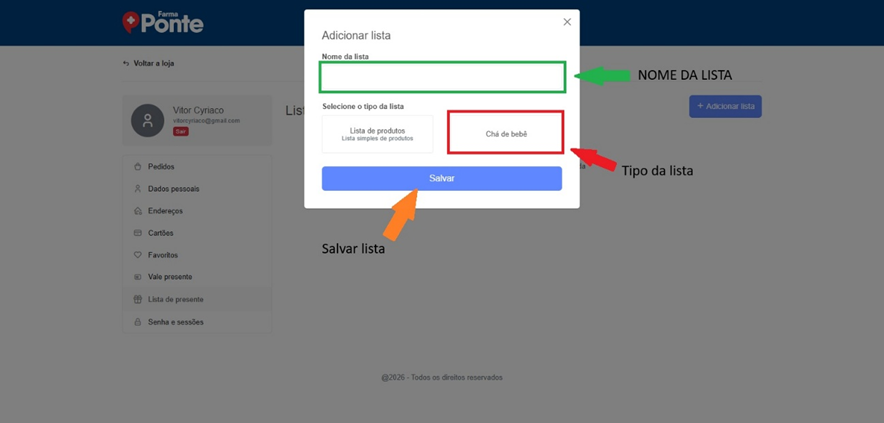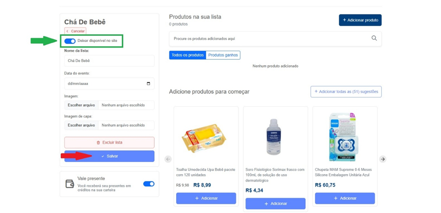 Informe o “Nome da lista”, selecione o tipo da lista como “Chá de bebê” e clique em “Salvar”.