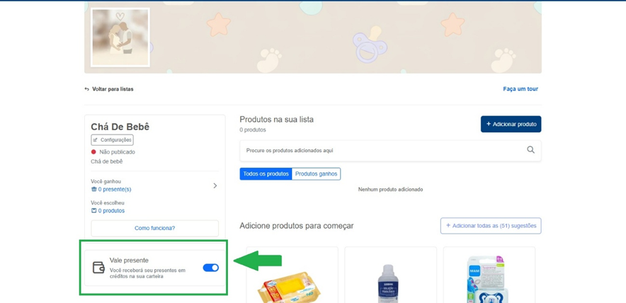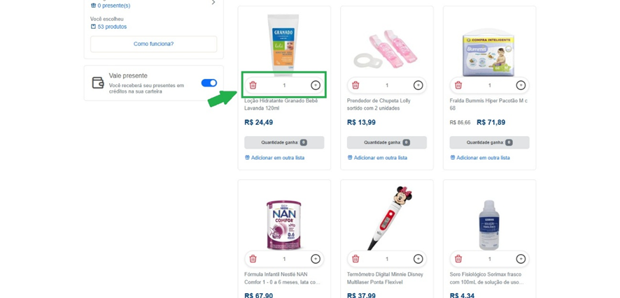 É possível escolher a forma em que o presente comprado pelo convidado será recebido marcando ou desmarcando o botão no campo “Vale Presente”. Caso marcado, os produtos da lista passam a ser simbólicos e o valor referente a eles se tornam créditos na carteira. Esses créditos podem ser utilizados para compras no site de acordo com a preferência de quem criou a lista.