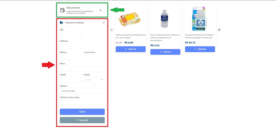 Aparecerá um campo para cadastrar um endereço de entrega dos produtos que obrigatoriamente deverá ser preenchido.