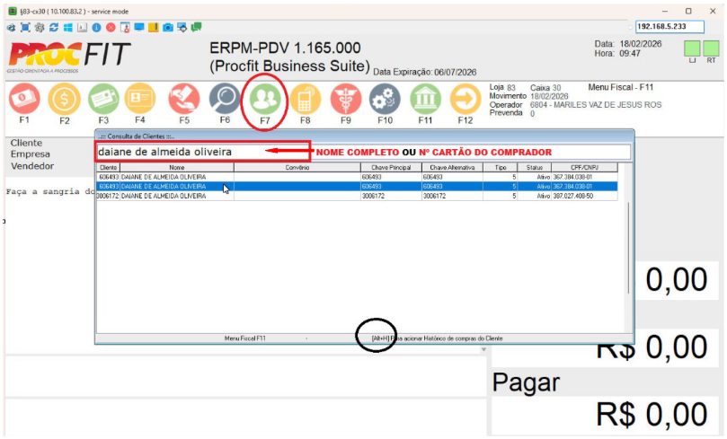 Em seguida selecionar o cliente e clicar Alt+H no teclado para aparecer histórico de compras e realizar a reimpressão.