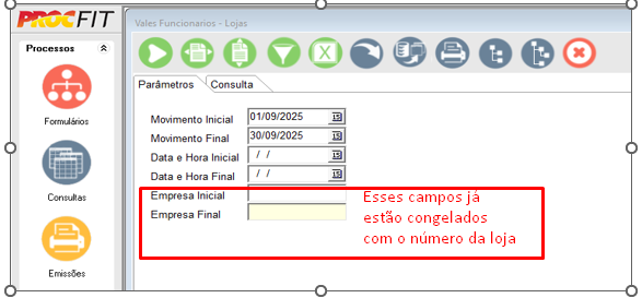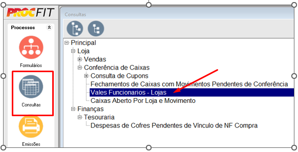 Procfit > Consultas > Loja > Conferência de Caixa > Vales Funcionários – Lojas