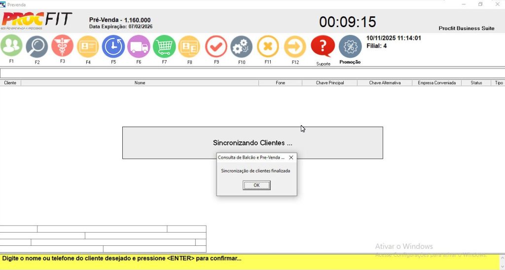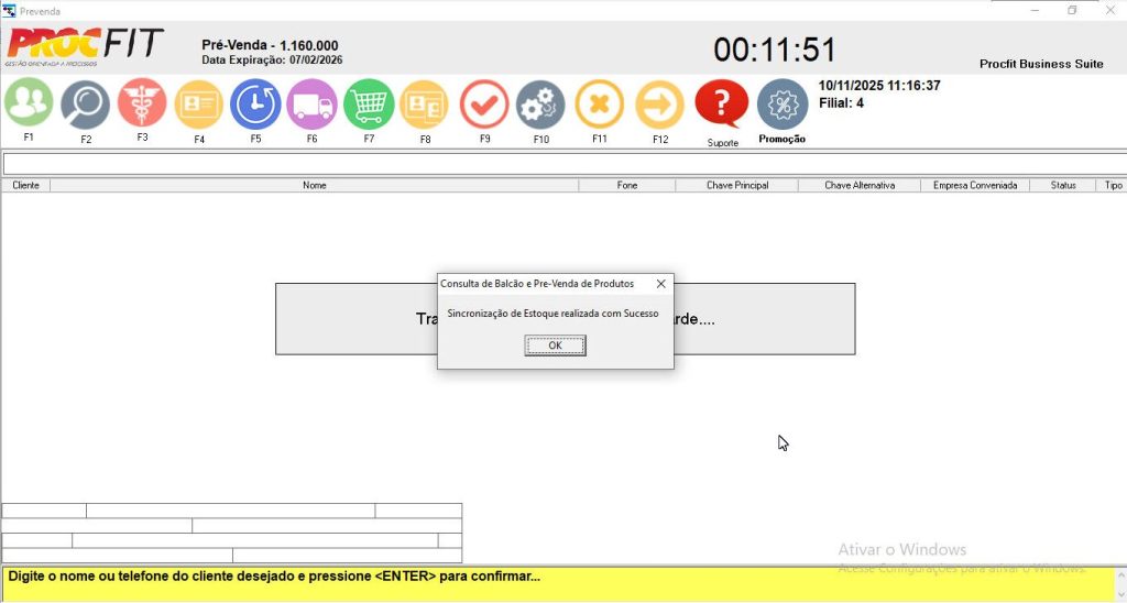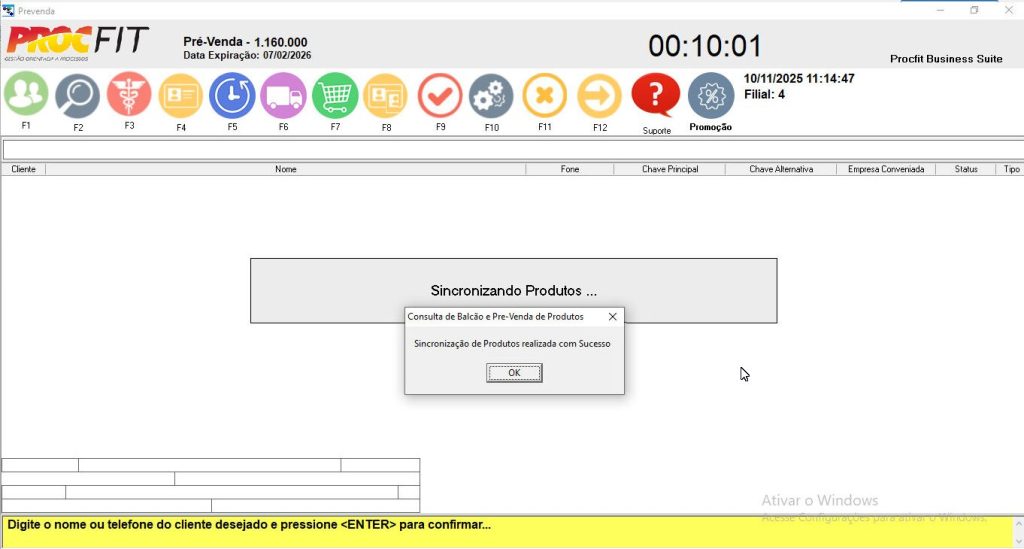 Na tela do prevenda, com a tecla CAPS LOCK do teclado ativada, aplicar o comando CTRL + B, aparecerá a tela de sincronização, não saia da tela até aparecer a mensagem de conclusão do processo.